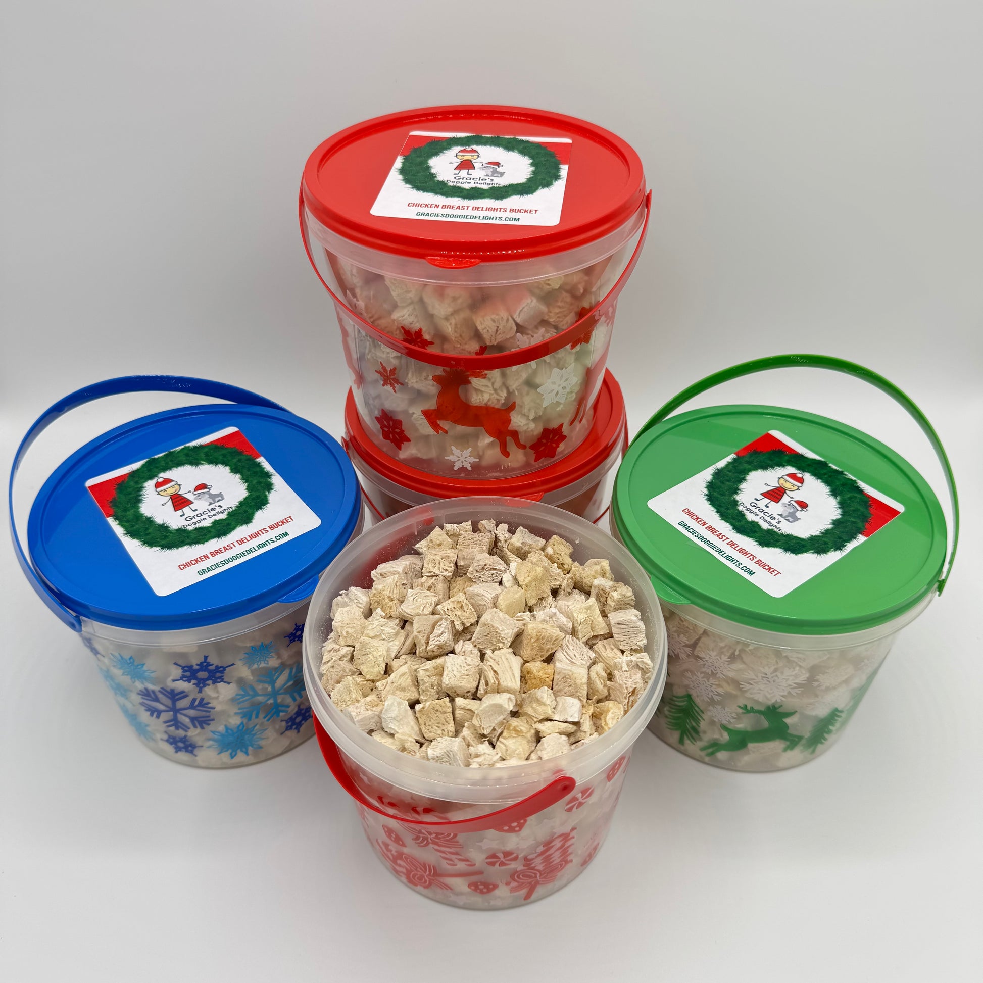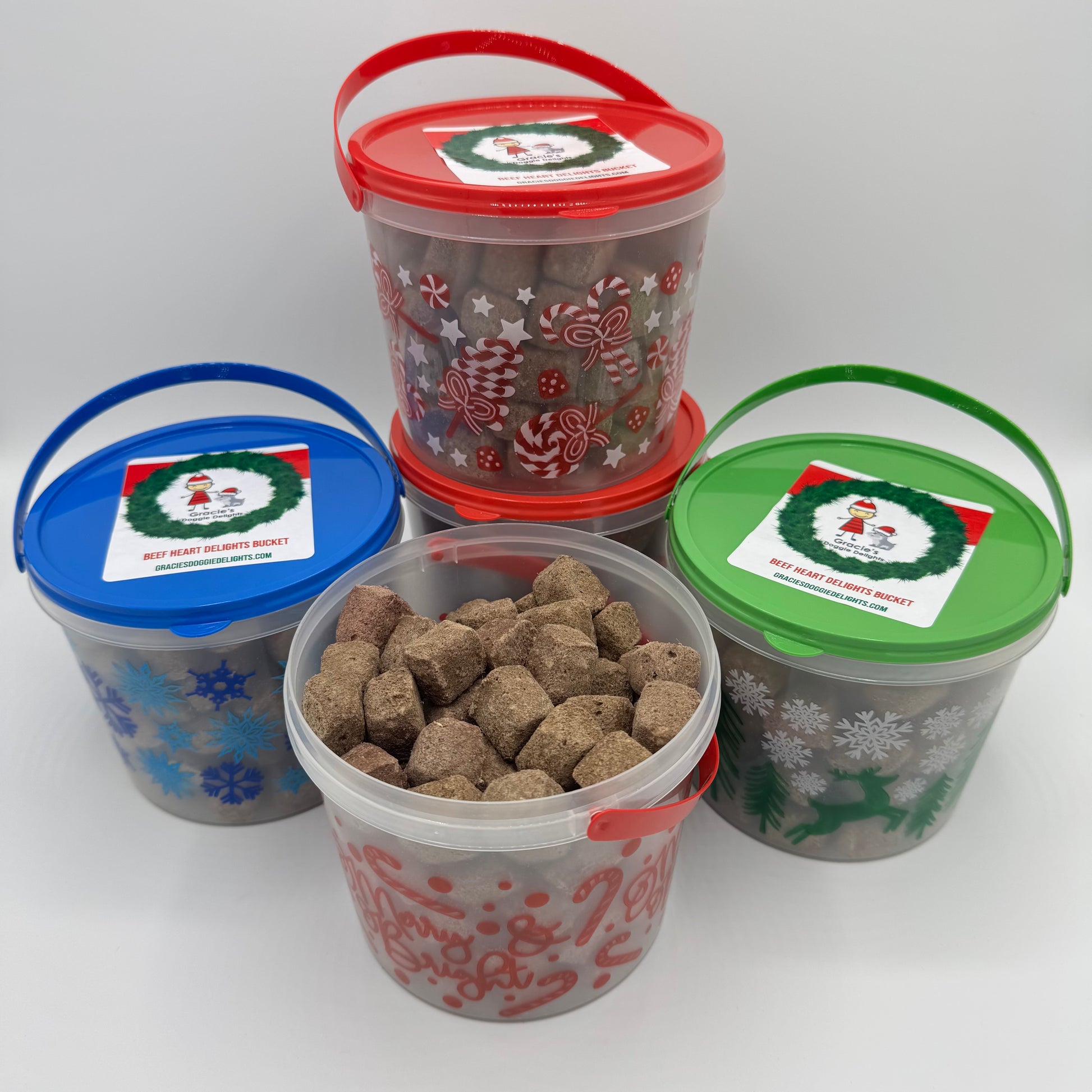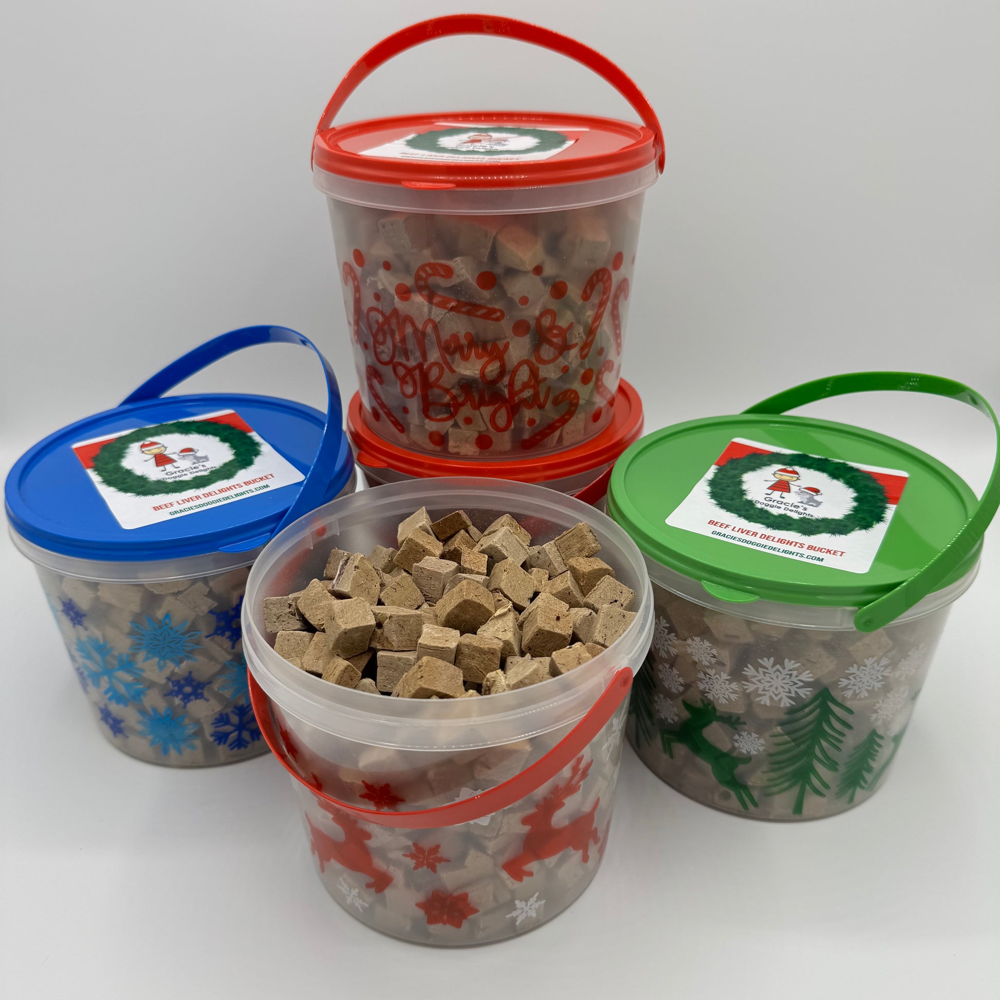 A cute little decorative Christmas bucket packed full of Gracie's Treats. A perfect stocking stuffer for your G-Dog or G-Cat. New this year, choose from four flavors: