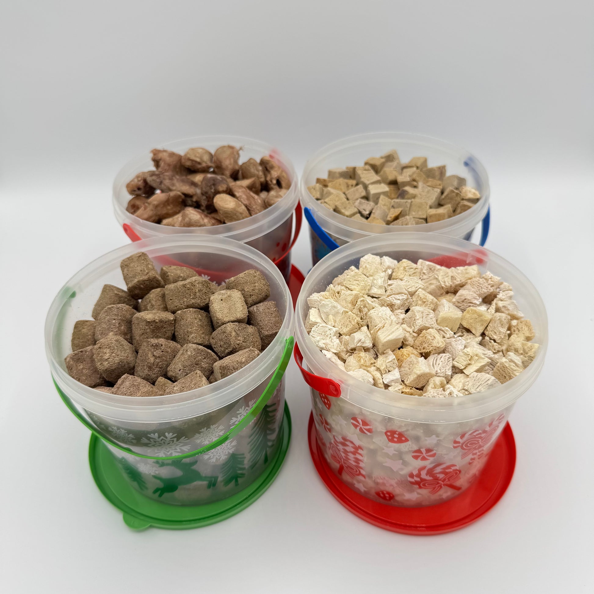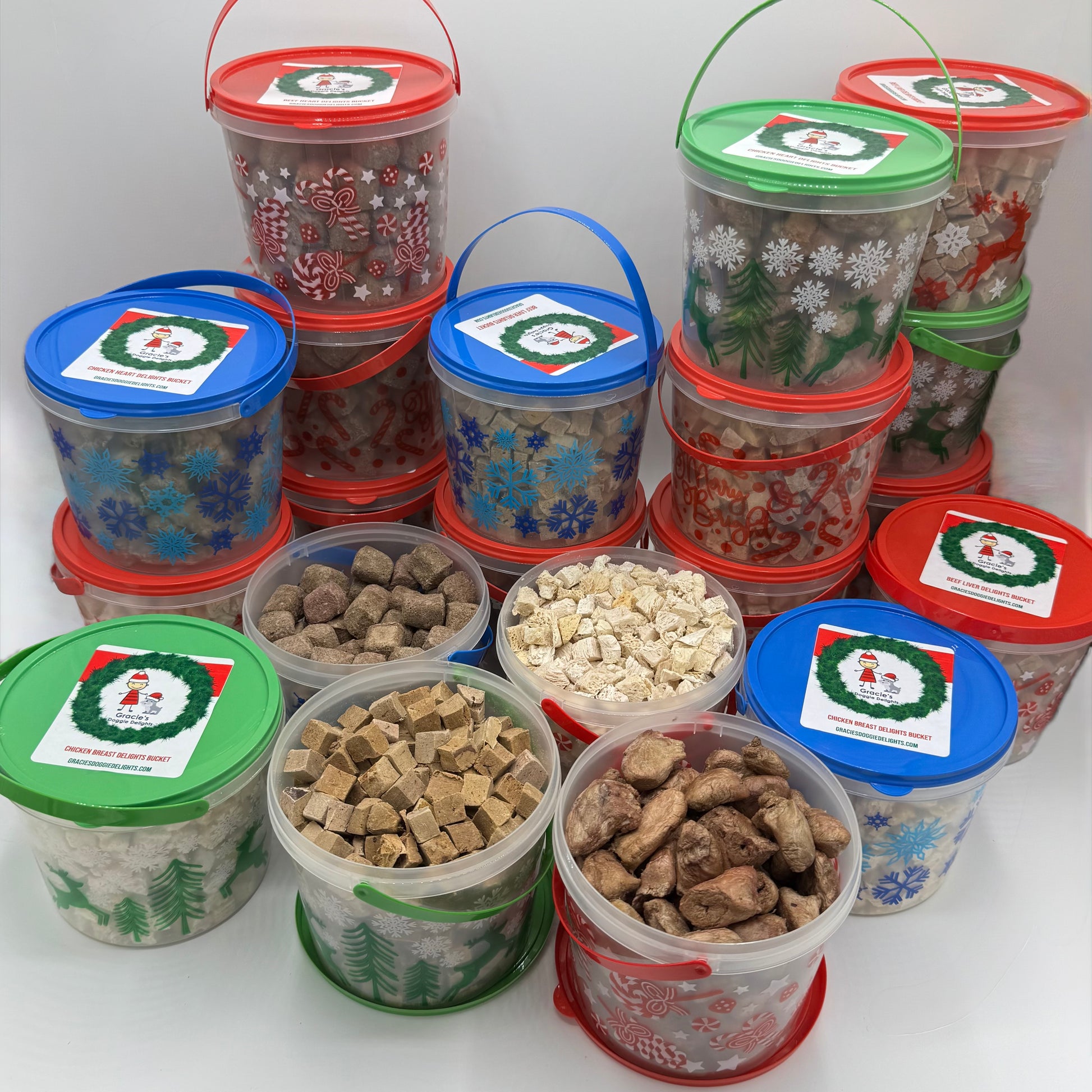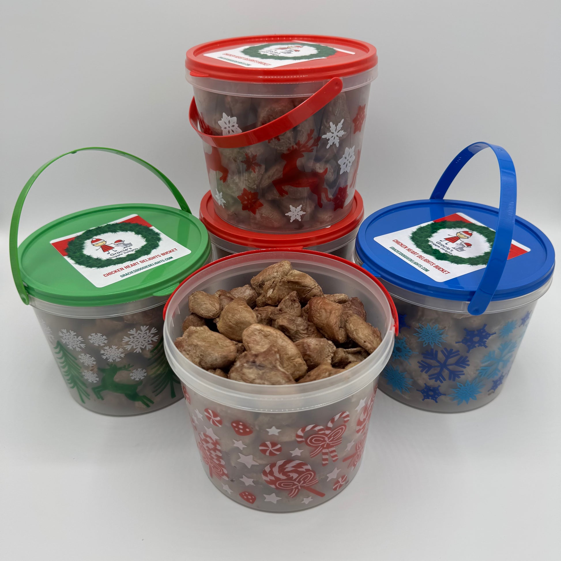 A cute little decorative Christmas bucket packed full of Gracie's Treats. A perfect stocking stuffer for your G-Dog or G-Cat. New this year, choose from four flavors: