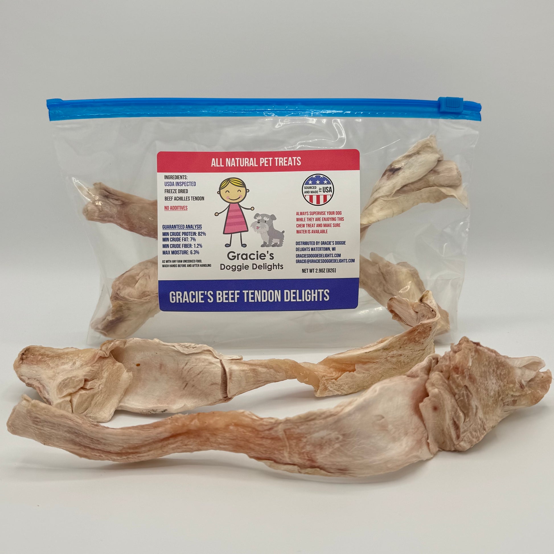 Give your dog a healthy, satisfying chew with Gracie’s Beef Tendon Delights. These all-natural freeze-dried beef Achilles tendons are packed with protein and irresistible flavor. Each tendon is 8 to 12 inches in length. The Beef Tendon Delights single-ingredient chews are naturally tough and fibrous, offering a long-lasting, satisfying chew that supports your dog’s overall well-being.
